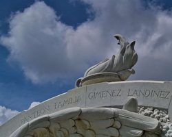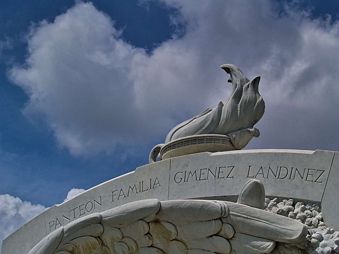 Representa el cielo que alberga bajo sus alas y protege como madre, bajo el fundamento cristiano, a quienes descansarán allí. Sobre el prominente bulto de piedra de la familia Giménez Landínez, está tallada una lámpara con fuego llameante: simboliza la luz perpetua que ilumina el camino del difunto luego de la muerte.