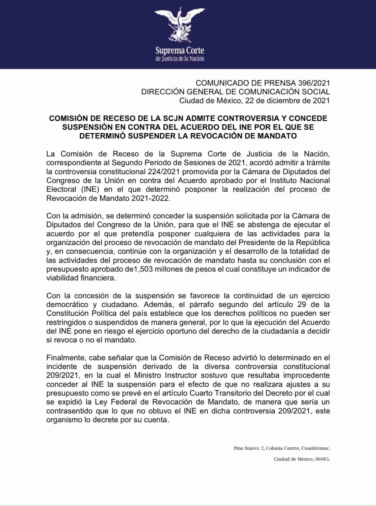 La autoridad electoral afirmó que el costo de la consulta es de poco más de 3 mil 800 millones de pesos y determinó posponer la fecha de la consulta en lo que la Suprema Corte de Justicia de la Nación (SCJN) determina si el recurso que presentó por la falta de recursos en el Presupuesto de Egresos es válida o no, aunque al momento de escribir estas líneas, la Comisión de Receso de la SCJN admitió la controversia presentada por la Cámara de Diputados para suspender el acuerdo del INE para posponer la revocación de mandato.