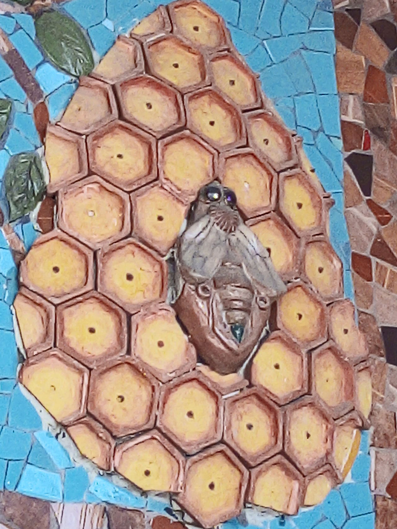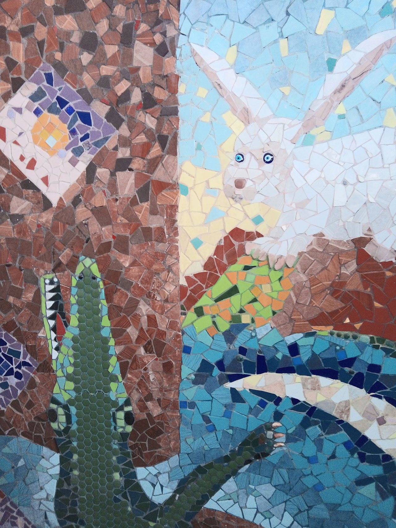 El mural de Alejandro Caballero es una yuxtaposición plástica de la literatura de Andrés Henestrosa, de los vocablos binigulaza (gente antigua), neza (camino) y gosiguie (siembra) traducidos del zapoteca al español, por Maricarmen Trucios. Es un trabajo usando la técnica de mosaico de colores, piedras especiales y relieves de barro horneado. Lo cierto es que el Mural me recuerda las barrocas invenciones plásticas cinematográficas imaginadas y teorizadas por Eisenstein. La literatura y las artes plásticas inspiran cinematismo, imágenes en movimiento, hermanan la literatura, la plástica y el cine, lo que nos obliga a preguntar: ¿Por qué nadie filma (quizá ya, no lo sé) algo sobre Henestrosa que es tan cinematográfico?