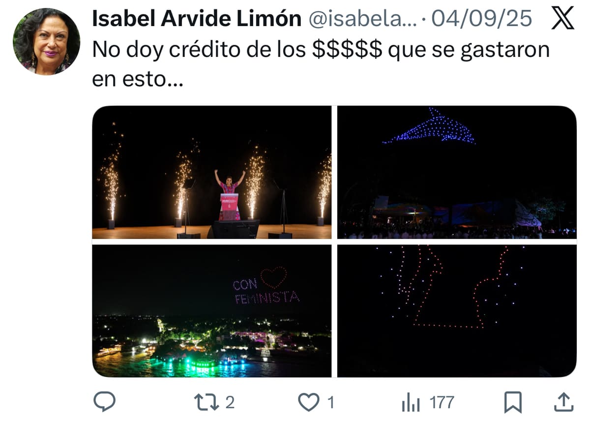 - Antes de dejar Turquía, Arvide difundió un mensaje de gratitud a López Obrador; en contraste, en sus redes ha criticado acciones que involucran a la actual presidenta, como un informe de la gobernadora de Quintana Roo en el que se formó con drones la silueta de Sheinbaum.