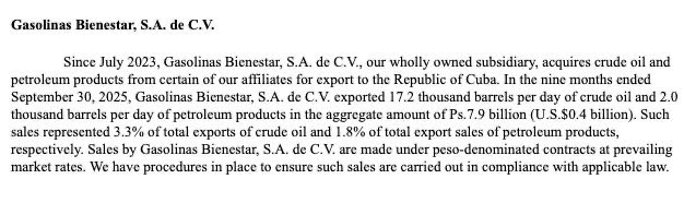 “Desde julio de 2023, Gasolinas Bienestar, nuestra subsidiaria de propiedad absoluta, adquiere petróleo crudo y productos derivados del petróleo de algunas de nuestras afiliadas para su exportación a la República de Cuba”, señala el reporte de diciembre de 2025 entregado a inversionistas de la Bolsa en Estados Unidos.