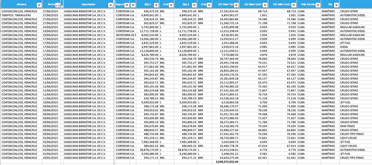 En su mayoría, detallan estas plataformas, las exportaciones realizadas entre el 29 de mayo y el 29 de septiembre de 2025 salieron del puerto de Coatzacoalcos, Veracruz, e incluyen productos como petróleo crudo, gasolina, diésel y turbosina.