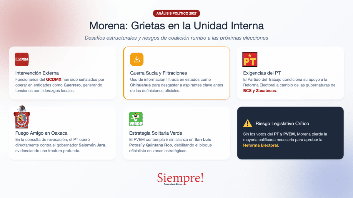La advertencia más clara para el oficialismo ocurrió en Oaxaca. Durante la consulta de revocación de mandato de Salomón Jara, el 38% de los votos se pronunció por su salida, un resultado impulsado por la movilización del PT. Este partido, que fue clave para el triunfo de Jara, hoy critica abiertamente su gestión, demostrando que la lealtad tiene fecha de caducidad.