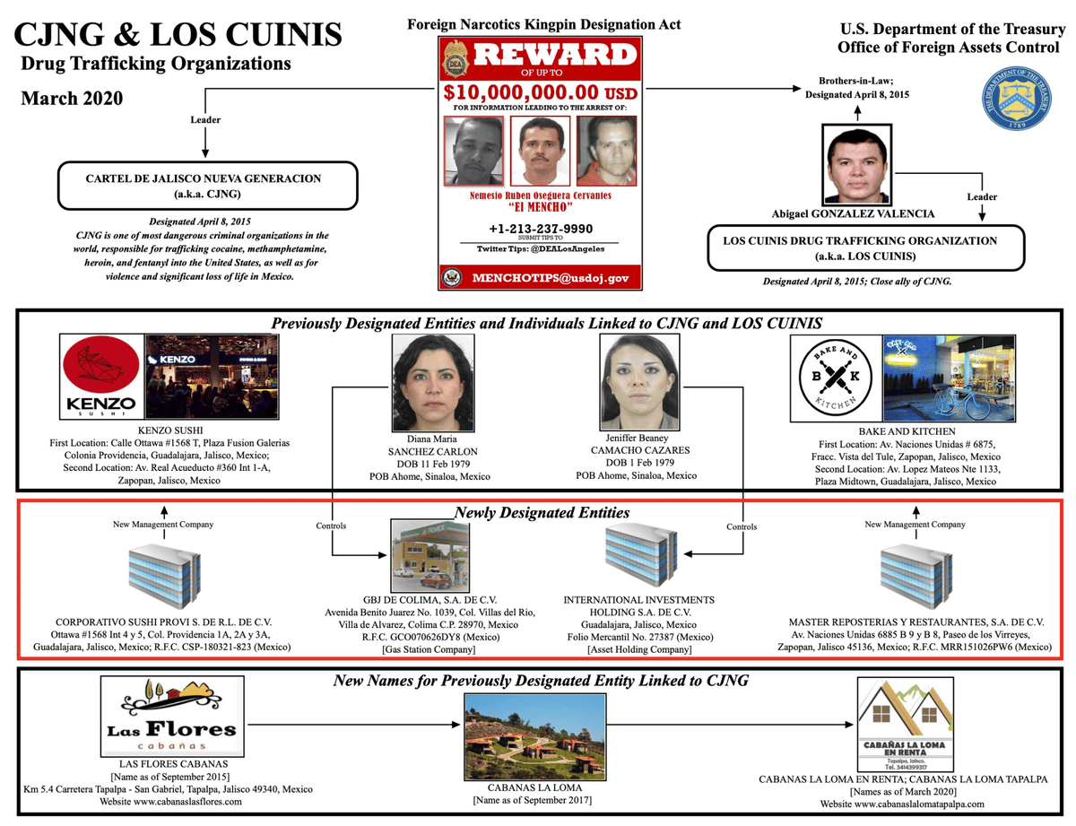 Un organigrama oficial de la Oficina de Control de Activos Extranjeros (OFAC), fechado en marzo de 2020, identifica tres conjuntos de cabañas ubicados en Tapalpa -en la zona donde ocurrió el operativo- como entidades financieras vinculadas al CJNG y a Los Cuinis.