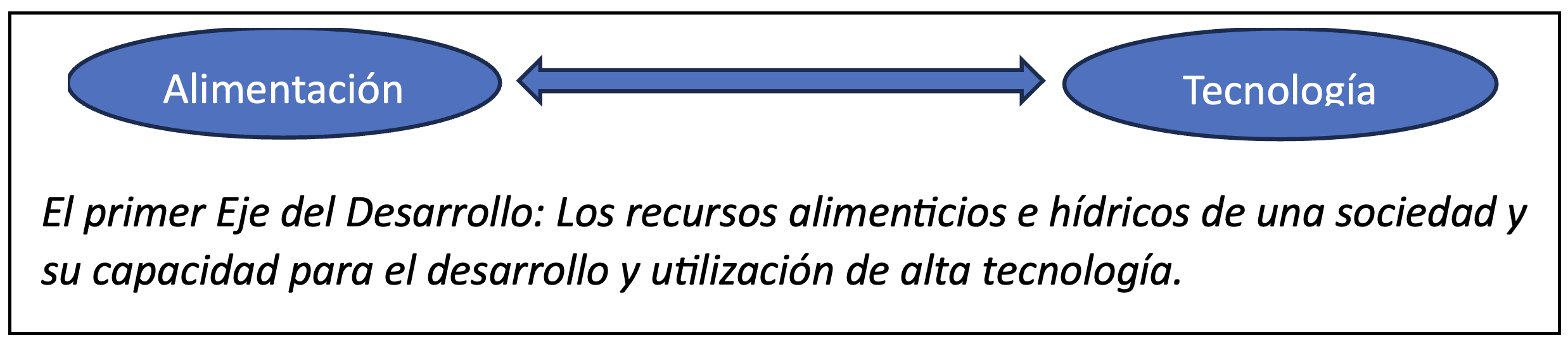 En consecuencia, mientras que uno de los extremos de este eje representa la capacidad de supervivencia de la sociedad (capacidad alimenticia e hídrica) su contraparte es el motor que le otorga dinamismo a ésta y le impulsa al porvenir (producción y empleo tecnológico). Todas las sociedades exitosas han invertido bajo un criterio de eficiencia terminal en estos dos rubros de manera prioritaria, patrón de comportamiento que se puede ver hasta nuestro contexto contemporáneo global. Aquellas sociedades que no sólo no han invertido en estos conceptos, sino que los han descuidado, ignorado o mermado se han condenado a la subordinación y al fracaso.