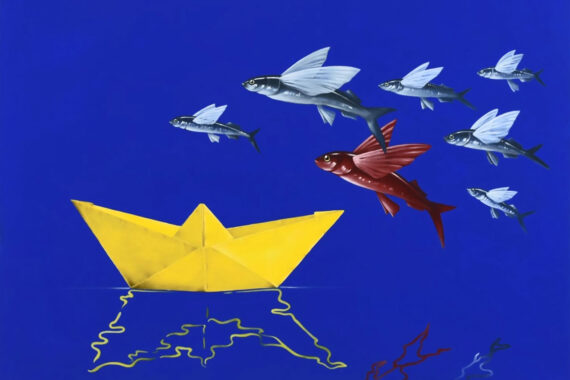 La obra de Leonardo Díaz nos presenta escenarios marinos en donde el agua es representada y sugerida por medio del movimiento, brillo y plieges de las telas, sensación que nos lleva a difuminar ambientes terrestres y marinos.